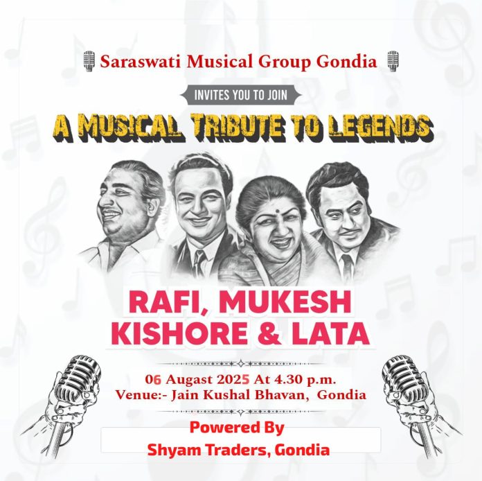 गोंदिया. शहर में संगीत प्रेमियों के लिए एक खास तोहफा तैयार है. श्याम ट्रेडर्स, बालाघाट रोड गोंदिया के सौजन्य से सरस्वती म्यूजिकल ग्रुप द्वारा 6 अगस्त को ‘ए म्यूजिकल ट्रिब्यूट टू लेजेंड्स’ का आयोजन किया जा रहा है. इस सुरमयी शाम में हिंदी फिल्म संगीत के अमर गायक मोहम्मद रफी, मुकेश, किशोर कुमार और लता मंगेशकर को संगीतमय श्रद्धांजलि दी जाएगी.