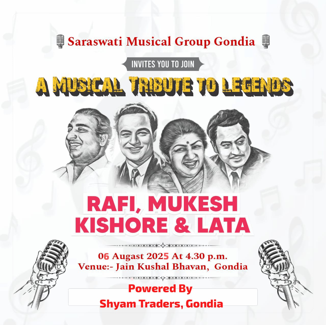 गोंदिया में गूंजेंगे रफी-मुकेश-किशोर और लता के अमर तराने, 6 अगस्त की शाम जैन कुशल भवन बनेगा सुरों का दरबार