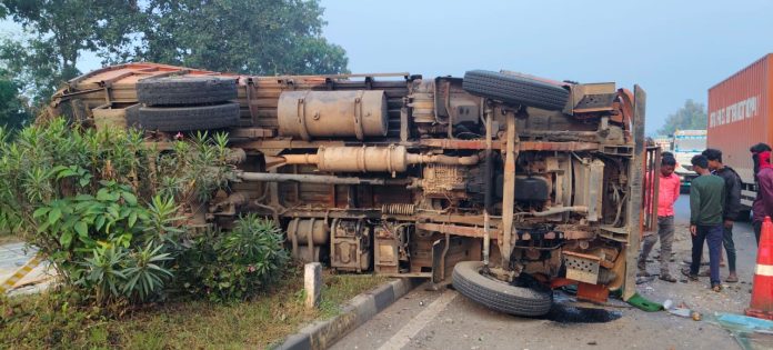 टाईल्स भरा ट्रक पलटा, एक की मौत, पांच घायल, ब्राम्हणी खड़की की घटना