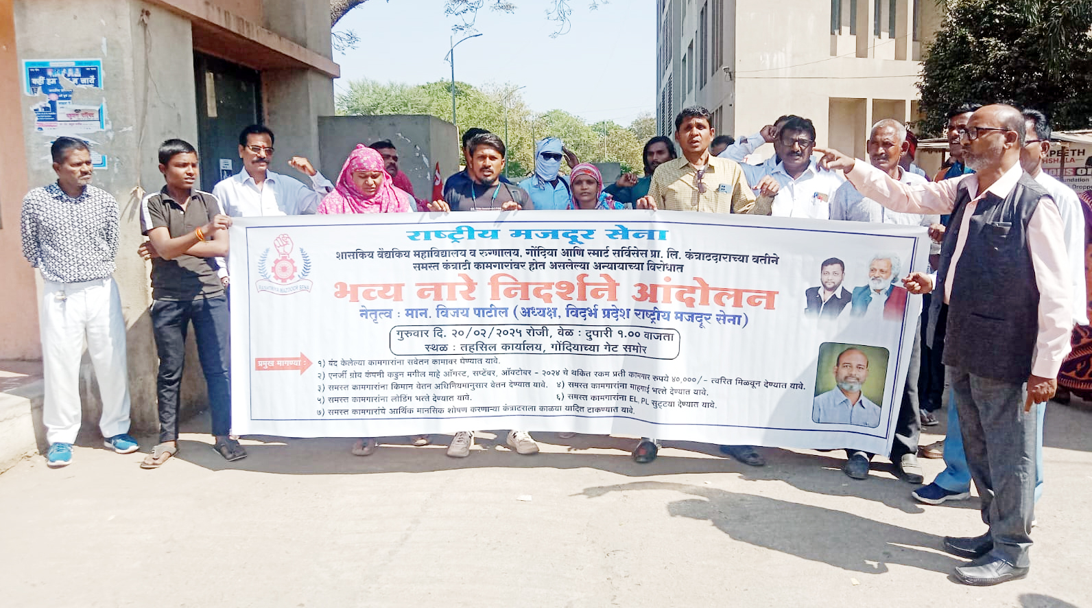 संविधा कर्मि पल्लवी रामटेके व राजेश गजभिये स्मार्ट सर्विसेस प्रा.लि. के तहत शासकीय वैद्यकीय महाविद्यालय व केटीएस जिला सामान्य अस्पताल में वार्ड बॉय व सफाई कर्मचारी के रुप में काम कर रहे हैं. स्मार्ट सर्विसेस ने पिछले 3 माह का वेतन व एनर्जी ग्रोव कंपनी ने दो माह 10 दिन का वेतन नहीं दिया है. जिसके लिए 13 जनवरी को शासकीय वैद्यकीय महाविद्यालय के आगे आंदोलन किया गया था. उसके बाद अधिष्ठाता डा. कुसुमाकर घोरपडे के साथ चर्चा के दौरान दो माह का वेतन आठ दिनों में सभी कामगारों को दिया गया. एनर्जी ग्रोव कंपनी के दो माह दस दिनों का वेतन आज तक नहीं दिया गया है. कर्मियों ने आंदोलन करने पर ठेकेदार ने कर्मियों को आर्थिक व मानसिक परेशान करना शुरू कर दिया. वहीं पल्लवी रामटेके और राजेश गजभिये को नियमानुसार कोई कार्रवाई किए बिना अवैध रूप से काम से निलंबित कर दिया गया है. क्या कामगारों के लिए अन्याय का विरोध करना अपराध है? स्मार्ट सर्विसेज के वरिष्ठ अधिकारी और सफाई निरीक्षक धमकी दे रहे हैं कि अगर कर्मचारी यूनियन बनाकर विरोध करेंगे तो उन्हें काम से स्थायी रूप से निलंबित कर दिया जाएगा. जिन श्रमिकों को काम से हटा दिया गया है, उन्हें तुरंत पूर्ण वेतन के साथ वापस काम पर रखा जाए, आदि विभिन्न मांगों को लेकर 20 फरवरी को दोपहर 1 बजे तहसील कार्यालय के आगे राष्ट्रीय मजदूर सेना के विदर्भ प्रदेश अध्यक्ष विजय पाटिल के नेतृत्व में आंदोलन किया गया.