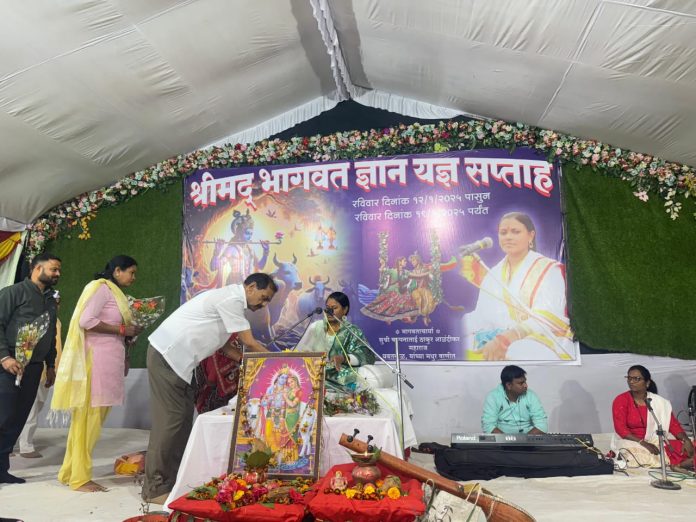 गोंदिया : मां भगवती एवं विठ्ठल रुखमाई देवस्थान गणेश मंदिर परिसर, मौजा पारडीबांध (डोंगरगाव) ता.गोंदिया येथे श्रीमद् भागवत कथा वाचक प.पू. ह.भ.प. कल्पणाताई ठाकूर (आळंदीकर) यांच्या अमृतवाणीतून श्रीमद भागवत ज्ञानयज्ञ सप्ताह कार्यक्रमाचे आयोजन केले आहे. श्रीमद् भागवत कथेचा लाभ घेत माजी आमदार श्री राजेंद्र जैन यांनी श्रीमद भागवत पुराणची मनोभावे पुजा केली व आशिर्वाद घेतला.